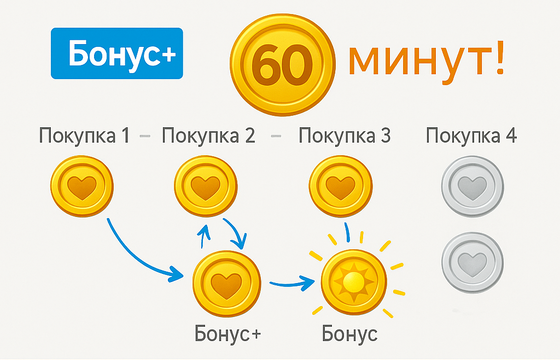 Покупка 3. Не прошло 60 минут, и Вы купили ещё 30 золотых. Удваивается покупка 2 — Вы получаете +30 золотых бесплатно!
