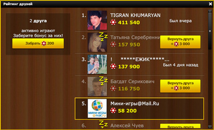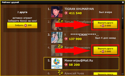 Да, и сотрудничество это взаимовыгодное: вы получаете фишки за друзей, друзья получают фишки за вас, а если у вас вдруг есть такие партнеры по играм, которых давно не было на портале, то, вернув их, вы заработаете сразу несколько тысяч фишек.