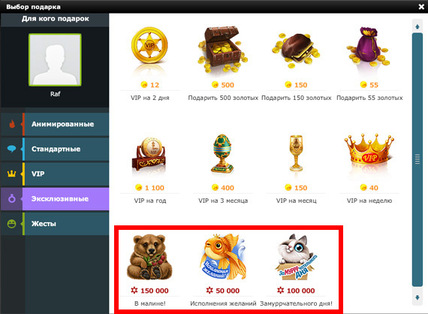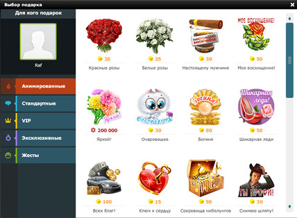 Выберите подарок из раздела «Эксклюзивные» и Ваш адресат получит фишки в той игре, из которой Вы отправили подарок.